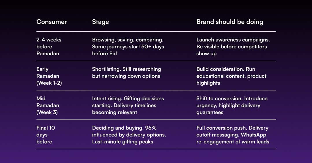 Research from Criteo tracking retail sales across Southeast Asia found that purchases made in the final two weeks of Ramadan involved an average of 19 days between a shopper's first product visit and completed purchase with some journeys extending beyond 50 days. This means consumers who buy at Eid often started researching before Ramadan even began.